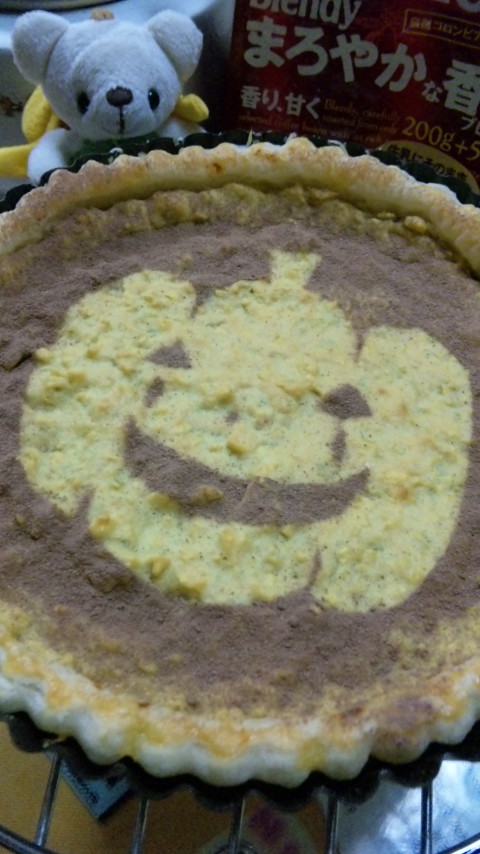 ・粗熱が取れたパイに紙を乗せ、ココアをふるって完成!